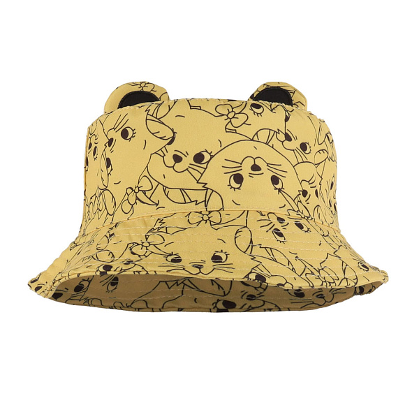 Изделие выполнено в бежевом цвете, декорировано изображениями кошек по всей поверхности. Сверху к панаме пришиты симпатичные забавные ушки. Этот модный аксессуар придает изделию особое очарование.