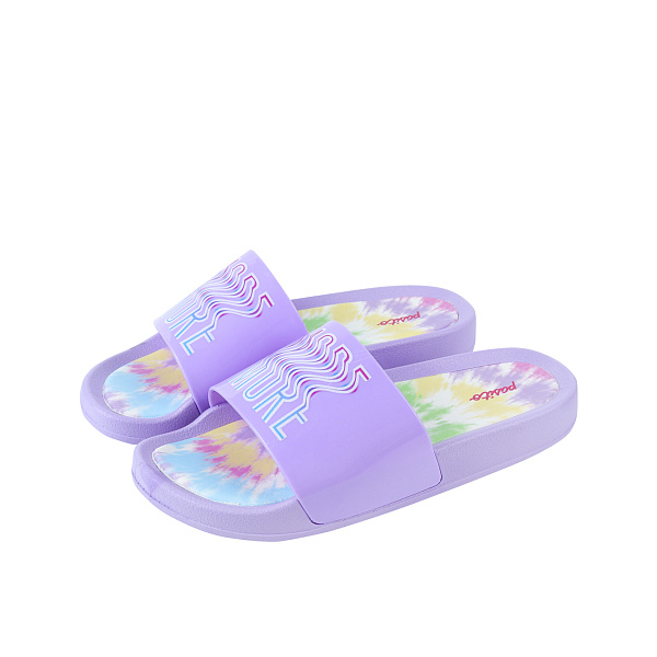 Модель выполнена в нежной фиолетовой расцветке, добавлен тематический рисунок и подпись о любви к морю. Пантолеты подойдут девочке школьного возраста, предназначены для походов на пляж, неспешных летних прогулок на природе. Застежка отсутствует – обувь можно быстро надеть и снять.