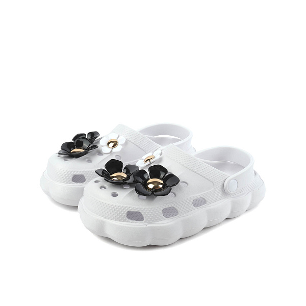 Пляжные пантолеты для девочки школьного возраста пригодятся летом для отдыха и прогулок. Обувь из материала ЭВА (этиленвинилацетат) имеет немало преимуществ: она легкая, долговечная и несложная в уходе. Белые пантолеты спереди украшены декоративными фигурными элементами в виде цветов. Конструкция обуви с открытой пяткой и большим количеством отверстий помогает обеспечивать естественную вентиляцию ног, что особенно важно в жаркую погоду. Задник в виде ремешка надежно удерживает обувь на ногах. Ровная подошва с протектором позволяет уверенно бегать и участвовать в активных играх.