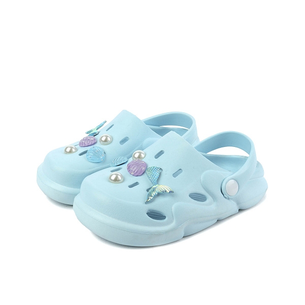 Пляжные пантолеты для девочки дошкольного возраста сделают малышку самой большой модницей среди сверстниц благодаря объемным декоративным элементам в виде морских ракушек и русалочьих хвостов. Детская обувь из материала ЭВА (этиленвинилацетат) имеет легкий вес, а также долговечна в эксплуатации и гигиенична. Конструкция с открытой пяткой с ремешком вместо задника и дополнительными отверстиями обеспечивает естественную вентиляцию ступней. В такой обуви ноги не будут потеть даже в самую жаркую погоду. Упругая подошва с рифленым протектором устойчива на поверхностях разного типа.