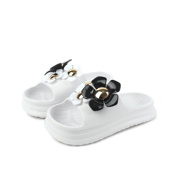 Пляжные пантолеты для девочки дошкольного возраста станут универсальной летней обувью, которая пригодится и на пляже, и на прогулке. Детская обувь белого цвета украшена черными и белыми цветочками с золотистыми заклепками. Изготовленные из материала ЭВА (этиленвинилацетат) пантолеты имеют легкий вес, благодаря чему комфортно сидят на ноге. Такая обувь очень гигиенична, так как за ней легко ухаживать и она не впитывает влагу. Открытая конструкция без задника помогает обеспечивать естественную вентиляцию ног даже в самый жаркий день. Плоская ровная подошва имеет хорошую устойчивость как на твердых поверхностях, так и на песке или траве.