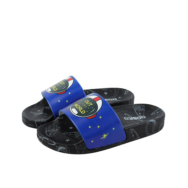 Пляжные пантолеты для мальчика дошкольного возраста — это универсальная летняя обувь для малыша, в которой можно отправиться на прогулку или на пляж. Верх яркого синего цвета украшен забавными рисунком с надписями на английском языке и звездами. Пантолеты изготовлены из материала ПВХ, благодаря чему имеют легкий вес и легко моются. Открытая конструкция удобной формы не имеет задника, что обеспечивает естественную вентиляцию стоп. Такую обувь легко надевать и снимать, не тратя лишнего времени на сборы. Подошва имеет хорошую устойчивость как на твердом асфальте, так и на мягком песке.