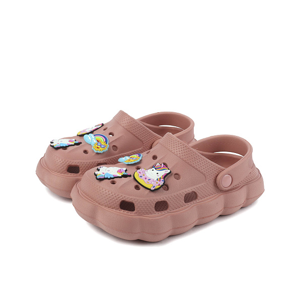 Пляжные пантолеты для девочки ясельного возраста — это комфортная летняя обувь для непоседы, которая обожает исследовать окружающий мир. Модные пантолеты розового цвета спереди украшают декоративные фигурные элементы в виде единорогов и радуги. В таких удобных пантолетах можно отправиться на прогулку по пляжу в поисках ракушек или пойти на детскую площадку во дворе, чтобы поиграть с мамой и друзьями. Легкая и удобная детская обувь изготовлена из материала ЭВА (этиленвинилацетат), нетребовательного в уходе и долговечного. Сабо с открытой пяткой имеет вместо задника ремешок, который помогает удерживать обувь на ногах. Благодаря упругой подошве с рифленым протектором обеспечивается хорошая устойчивость на разных поверхностях.