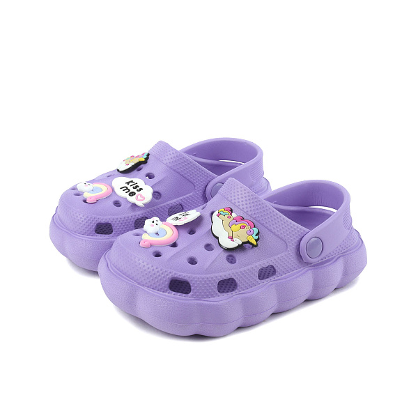 Пляжные пантолеты для девочки ясельного возраста — это удобная летняя обувь для маленькой красавицы. Модные пантолеты фиолетового цвета спереди украшают декоративные фигурные элементы в виде единорогов и облаков, добавляющие шарма и очарования. В такой обуви можно отправиться на прогулку по пляжу или на детскую площадку во дворе. Пантолеты изготовлены из материала ЭВА (этиленвинилацетат), благодаря чему очень легкие по весу и нетребовательные в уходе. Конструкция, специально разработанная для детской стопы, имеет открытую пятку с ремешком-задником и дополнительные отверстия для естественной вентиляции. Благодаря упругой подошве с рифленым протектором обеспечивается устойчивость и уменьшается риск падения.