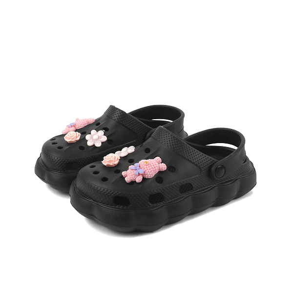 Пляжные пантолеты для девочки дошкольного возраста — это универсальная летняя обувь, которая пригодится не только на пляже. В такой удобной обуви можно отправиться в гости или на прогулку. Пантолеты черного цвета украшены спереди декоративными фигурными элементами, которые понравятся каждой юной моднице. Обувь изготовлена из материала ЭВА (этиленвинилацетат), поэтому имеет очень легкий вес. Специальная конструкция с открытой пяткой и большим количеством отверстий обеспечивает естественную вентиляцию стоп. Задник в виде ремешка надежно удерживает обувь на ногах во время быстрой ходьбы или бега. Благодаря устойчивой подошве с протектором пантолеты комфортны в носке.