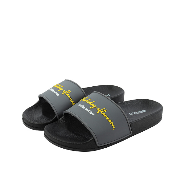 Пляжные пантолеты для мальчика школьного возраста — это универсальная летняя обувь для подростков, которая выглядит вполне по-взрослому. Верх практичного серого цвета украшен надписями на английском языке. В таких модных пантолетах мальчик может отправиться погулять в компании друзей во дворе или пойти на пляж. Обувь изготовлена из материала ПВХ, благодаря чему имеет легкий вес и почти не чувствуется на ногах. Открытая модель без задника помогает обеспечивать естественную вентиляцию стоп, а также легко надевается и снимается. Благодаря плоской ровной подошве в такой обуви удобно стоять как на твердом асфальте, так и на мягком песке.