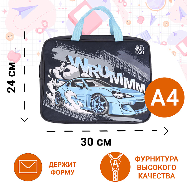 Папка с автомобильным дизайном — стильная и удобная папка для школьных тетрадей и документов. Лицевая сторона украшена впечатляющим изображением гоночного автомобиля в динамичном стиле. Основной цвет папки — темно-синий, который гармонично сочетается с голубыми текстильными ручками и молнией. Изготовлена из прочного и лёгкого в уходе материала, который надежно защищает содержимое от повреждений и загрязнений. Внутри папки достаточно места для хранения документов, тетрадей и учебников формата А4. Застёжка-молния по периметру обеспечивает удобный доступ к содержимому и надежно закрывает папку. Прочные текстильные ручки делают переноску папки удобной, что позволяет комфортно носить её в школу, на дополнительные занятия или кружки. Компактные размеры папки позволяют легко поместить её в школьный рюкзак или сумку.