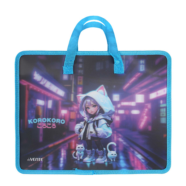 Папка А4 «Korokoro» – это стильный и практичный аксессуар для хранения документов и тетрадей. Яркий дизайн с изображением милого персонажа и кошек создает атмосферу приключений и сказочного мира.