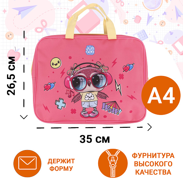 Папка А4 «Сова в наушниках» — яркая и функциональная папка для школьников. На розовом фоне красуется милая сова в наушниках, окруженная смайликами, сердечками и музыкальными нотами. Жёлтые ручки и молния гармонично дополняют дизайн, превращая папку в замечательный аксессуар. Изготовлена из прочного и износостойкого материала, папка надёжно защищает документы, тетради и учебники формата А4 от повреждений.