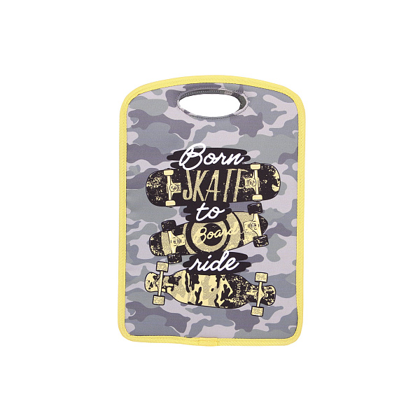 Вместительная папка для бумаг формата А4 подойдет школьникам средних и младших классов. В ней комфортно носить школьные тетради, учебники и рефераты, она не только легкая, но также стильная и вместительная. Папка изготовлена из ПВХ, поэтому дождь и снег ей не страшны. В папке два независимых отделения, застегиваемых на «молнию». Цветовое оформление – камуфляжное в серых тонах. На боковой поверхности нанесен принт – изображение трех скейтбордов и надпись на английском языке «born skate to board ride» (рожден, чтобы кататься на скейтборде). Изделие отделано желтым кантом.