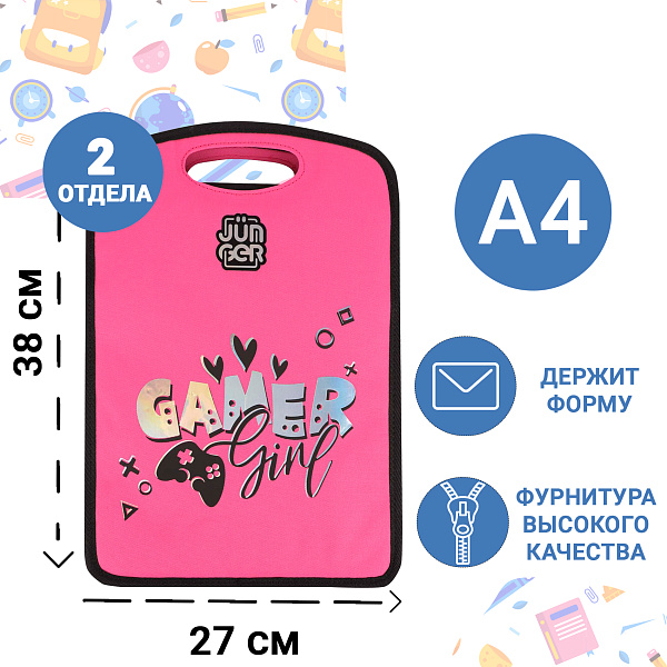Яркая розовая папка украшена крупной надписью, что добавляет оригинальности и обязательно понравится детям. На папке предусмотрены две вместительные секции на молниях, которые позволяют удобно разложить все необходимые принадлежности.