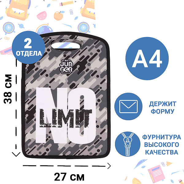 Папка оформлена в серых тона и украшена крупной надписью, что добавляет оригинальности и обязательно понравится детям. На папке предусмотрены две вместительные секции на молниях, которые позволяют удобно разложить все необходимые принадлежности.