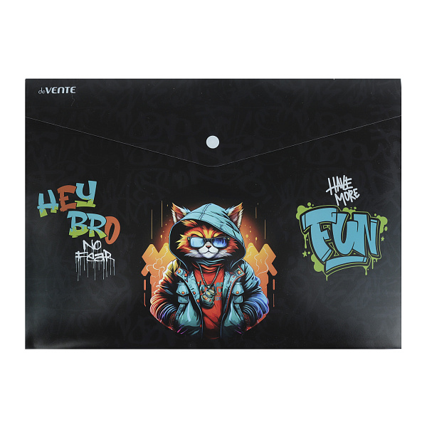 Папка для тетрадей и различных бумаг снабжена клапаном с кнопкой. Она надежно защитит содержимое от механического воздействия, пыли и влаги. Аксессуар привлекает внимание яркими рисунками на черном фоне. Такой дизайн понравится детям и подросткам, поможет им подчеркнуть свою индивидуальность.