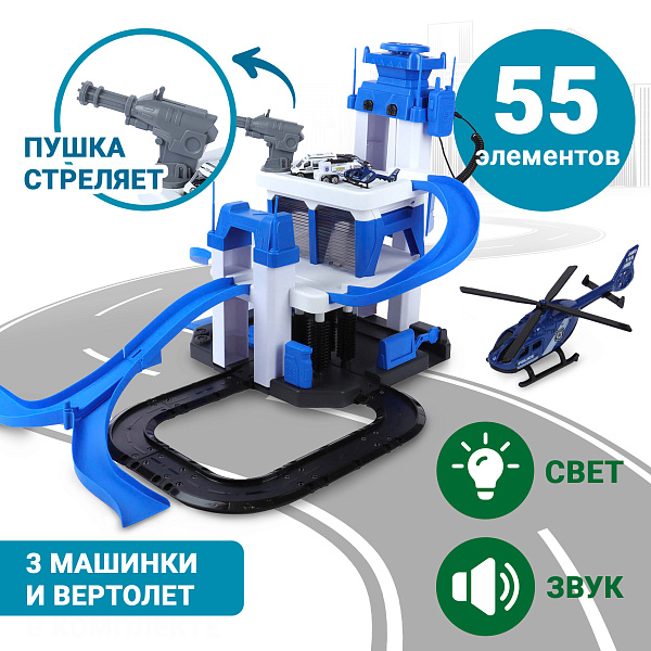 Многофункциональный детский игровой набор «Парковка: Станция полиции с рацией». Состоит из трехэтажного здания отделения полиции. Со всех сторон у игрушки пластиковые трассы, по которым машинки могут выезжать и заезжать внутрь.