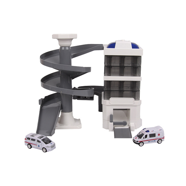 Как мальчикам, так и девочкам понравится игровой набор, позволяющий собрать современную станцию Скорой помощи. В комплекте двухэтажный транспортный комплекс с гаражом, винтовые спуски для быстрого выезда машин, два автомобиля скорой помощи. На крыше комплекса тревожный маячок, который светится и издает специальный звуковой сигнал. Для включения светозвуковых эффектов необходимы батарейки, которые имеются в комплекте набора. Сигналы включаются нажатием кнопки на вершине маяка. Цвет изделия – белый. Материал изготовления – металл и пластмасса.