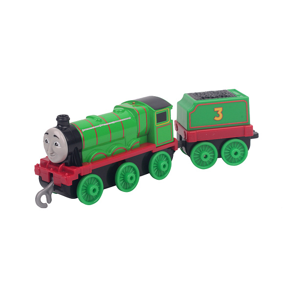 Игрушечный паровозик является уменьшенной моделью настоящего паровоза, но содержит дополнительные элементы в виде лица. Паровоз выполняется в трех цветах: зеленые колеса и корпус, красные полосы по корпусу и над колесами, черные труба и окно, а также серое сцепление. Вагон под номером три повторяет цветовую гамму паровоза, а также имеет уголь в верхней части. Все поезда инерционные, они приходят в движение благодаря силе ребенка, паровозик достаточно отвести назад и отпустить. С такой игрушкой ребенок легко перенесется в мир паровозика Томаса и поможет его друзьям преодолеть нелегкий путь на рельсах.