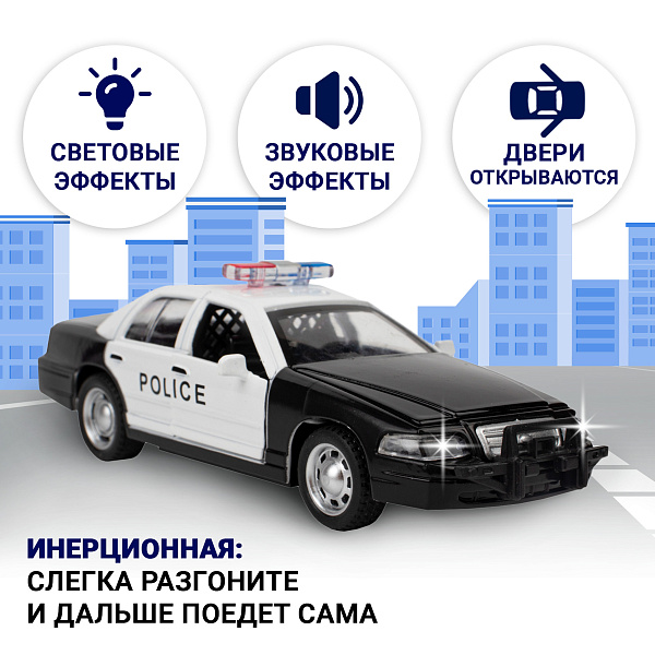 Реалистичная модель полицейской машины имеет открывающиеся двери и крышку капота. Автомобиль оснащен механизмом инерционного типа, а также дополнен световым и звуковым сопровождением. Игрушка предназначена для мальчиков старше 3 лет. Она надолго завладеет вниманием ребенка и подарит немало ярких эмоций. Манипуляции с техникой полезны для гармоничного развития детей, стимулируют воображение, логическое мышление, активируют моторные функции. Кузов изготовлен из прочного металла с пластмассовыми элементами, стойко переносящими существенные нагрузки. А компактный размер позволяет взять изделие с собой в гости, на прогулку, на дачу.