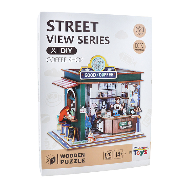 Деревянный 3D пазл в виде миниатюрной кофейни. Собранный объект имеет размеры 145×160×158 миллиметров. Игрушка подходит для детей от 14 лет. Композиция состоит из 120 деталей. Материалы: древесина и бумага. Детали соединяются без клея, по принципу «вставь и зафиксируй». На некоторых деталях — рисунки интерьера, вывесок и персонажей. Готовая модель показывает уютную кофейню с барной стойкой, окнами, столиками и фигурками людей.