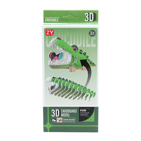 Пазл 3D «Крокодил» — это сборная модель из картона, позволяющая создать объемную фигуру хищника в характерной позе с открытым ртом. Игрушка состоит из предварительно вырубленных деталей, соединяющихся между собой за счет встроенных пазов и выступов без применения клея.