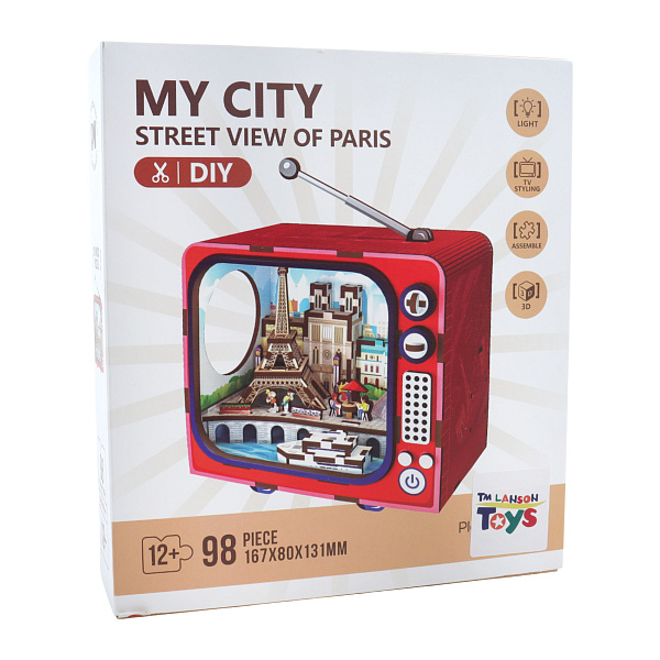 3D пазл в форме ретро-телевизора с изображением улицы Парижа. Собранный объект имеет размеры 167×80×131 миллиметр. Игрушка подходит для детей от 12 лет. В комплекте 98 деталей. Материал: древесина. Детали соединяются без клея, по принципу «вставь и зафиксируй». На деталях — рисунки Эйфелевой башни, лодок, мостов и зданий. Готовая модель показывает городской пейзаж внутри экрана телевизора.
