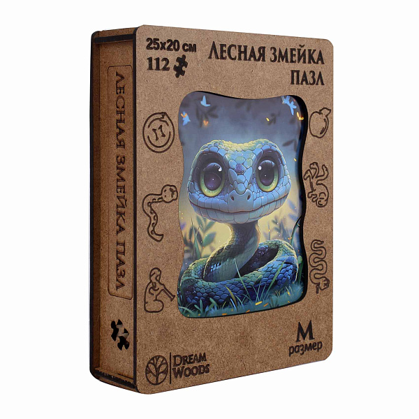 Деревянный пазл «Лесная змейка» — это уникальный и функциональный предмет для творчества. Изготовленный из ХДФ и бумаги, этот пазл предлагает яркое изображение лесной змейки с большими выразительными глазами и детализированным рисунком. Цветовая палитра пазла оживляет композицию, привлекает внимание и создает атмосферу загадочного леса.
