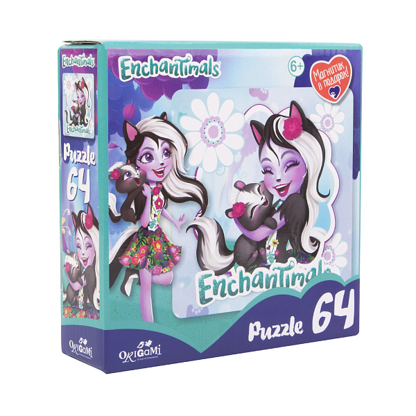 Оригинальная внешность героинь и их сказочные ручные зверюшки привлекают внимание, а картина с ними станет достойным украшением детской комнаты. До 6 лет задача может оказаться сложной — в коробке 64 детали, и единственная подсказка — это изображение на упаковке, так что помощь взрослых не будет лишней. Приятный символический презент от производителя — магнит по мотивам Enchantimals!
