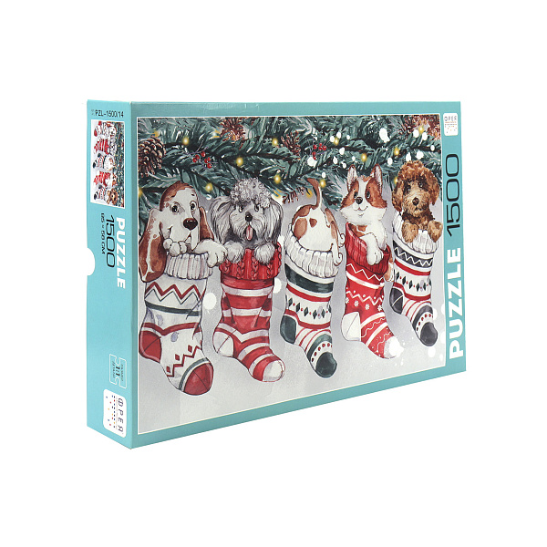 Подарите семье увлекательный вечер вместе с красочным пазлом «Новогодние щенки». В коробке представлено 1500 деталей, каждый пазл формата 1:1. Вам предстоит собрать их воедино, чтобы получилась цельная картина щенят, сидящих в новогодних носках.