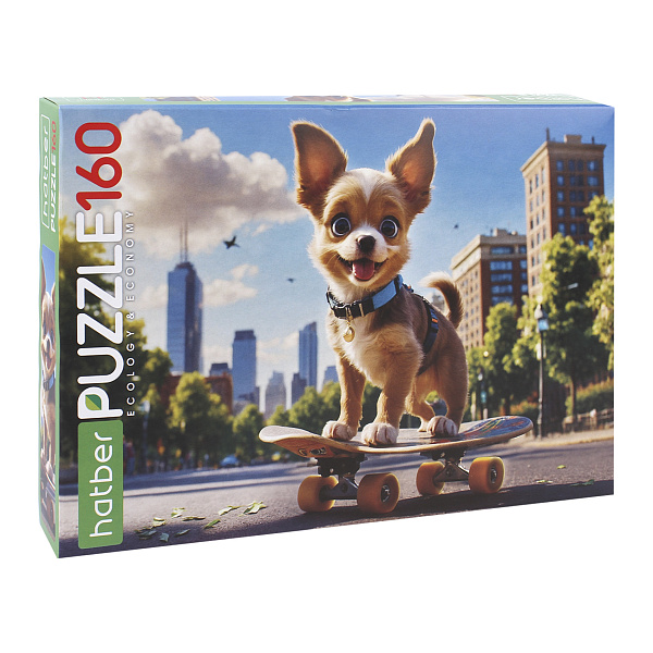 Пазл «Щенок на скейте» на 160 элементов представляет собой увлекательную головоломку, показывающую жизнерадостного щенка на скейтборде. Изображение выполнено в ярких тонах, передает динамику и веселье прогулки по городской улице, окруженной зеленью и небоскребами на горизонте.