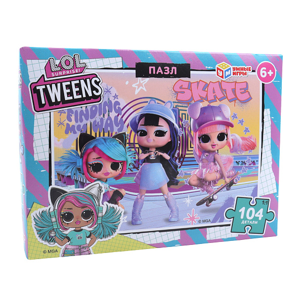 Пазл «LOL TWEENS» 104 элемента — увлекательная и яркая игра для детей от 6 лет, которая способствует развитию внимания, логики и усидчивости. Пазл выполнен в формате 330x237 мм и состоит из прочных картонных деталей с красочным изображением любимых героев серии «LOL TWEENS» на скейтбордах, что делает сборку интересной и захватывающей.