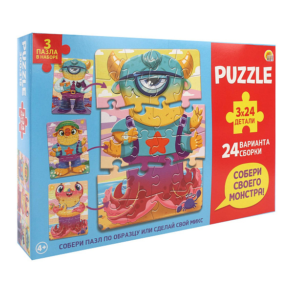 Набор пазлов «Монстры» включает три картинки, каждая из которых состоит из 24 деталей. Весь набор предлагает 24 варианта сборки за счет возможности комбинировать части между собой. Это позволяет создавать разнообразные образы и экспериментировать с внешним видом персонажей.