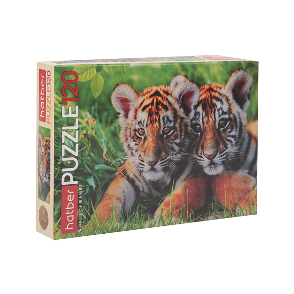 Паззл на 120 элементов с фотографией двух тигрят развлечет каждого ребенка. Высокое качество, яркость и насыщенность оттенков обеспечивается благодаря специальному каландрированному картону, который использован в качестве материала для изготовления настольной игры. Он отражает свет и покрыт экологически чистыми красками, не вызывающими аллергических реакций. Рисунок на них нанесен сублимационной печатью, что делает покрытие прочным, устойчивым к выгоранию и стиранию даже при неоднократной сборке.