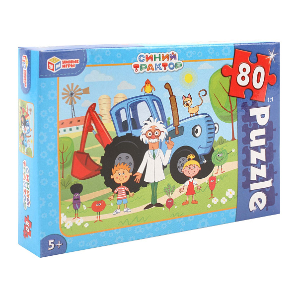 Пазл «Синий трактор» состоит из 80 деталей. С его помощью развивается логическое мышление и внимание, а также мелкая моторика рук. Игра помогает понять последовательность и способствует развитию усидчивости. Пазл предназначен для детей старше 5 лет. Собранная картинка с любимым персонажем может стать украшением детской комнаты. Такой пазл станет отличным выбором для совместного семейного досуга.