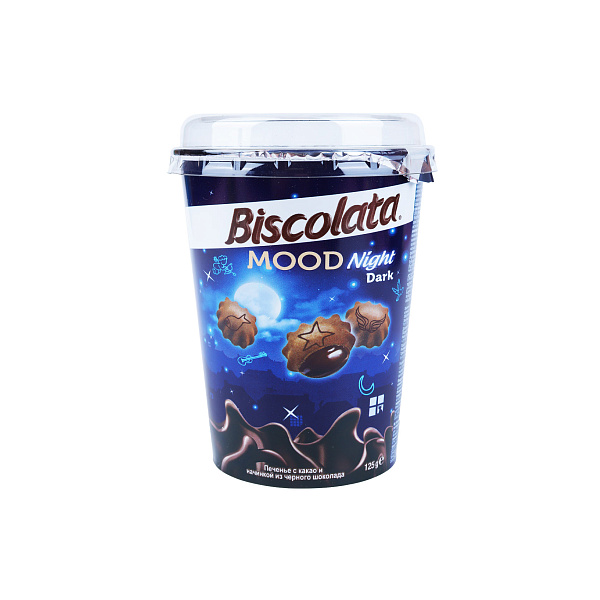 Печенье Biscolata станет излюбленным лакомством для каждого ребенка. Сладость упакована в красочный стакан, выполненный в оригинальной тематите: на темном небе красуются печеньки с надписью "MOOD Night Dark". Так каждый сладкоежка поймет, что внутри сладних печений начинка из темного шоколада с насыщенным характерным аромаом какао. В составе печений использована мука высшего сорта, а также добавление какао, что усиливает шоколадную сладость. При этом каждую печеньку украшает схематичный рисунок звезды, крыльев или хвоста. Такое лакомство не только чудесно утолит голод, но и превратит поедание сладости в увлекательную игру с отгадыванием рисунков.