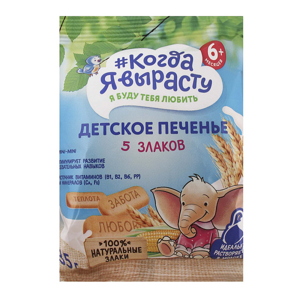 Детское печенье «Когда я вырасту» с пятью злаками подходит для детей старше 6 месяцев. Оно состоит из пшеничной, овсяной, кукурузной, рисовой и ячменной муки, сахара, растительного масла, сухого обезжиренного молока, картофельного крахмала и разрыхлителей. В состав также входят витаминно-минеральный комплекс (железо, витамины В1, В2, В6, РР), соевый лецитин и легкий ванильный ароматизатор.