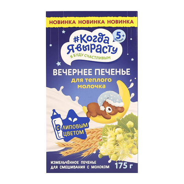 Печенье «Когда я вырасту» — это вкусное и полезное лакомство для малышей от 5 месяцев. На упаковке изображён милый медвежонок в ночном колпаке, сладко спящий на месяце, что привлекает внимание и вызывает улыбку. Печенье механически измельчено, что облегчает его растворение в теплом молоке, создавая нежную консистенцию, идеальную для маленьких детей.