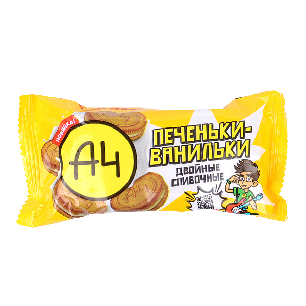 Печенье-сендвич со сливочным вкусом «А4» идеально для маленьких гурманов. Упаковка привлекает внимание жизнерадостным дизайном и изображениями любимых героев.