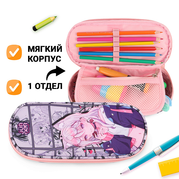 Этот милый пенал оценят юные поклонники аниме и манги. Пенал украшают рисунки персонажей в стиле азиатских художников. Пенал имеет один вместительный отдел, который дополняет небольшой карман посередине. Для удобства хранения и сохранения порядка в пенале предусмотрены эластичные петельки для карандашей и ручек, а также сетчатый карман для мелких предметов, например ластиков, точилок и стикеров.