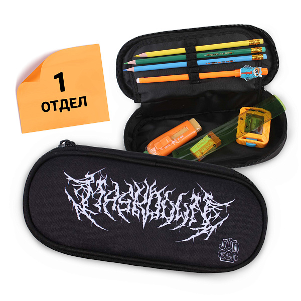 Элегантный черный школьный пенал с белым принтом идеально подходит для организации школьных принадлежностей. Изготовлен из полиэстера, что обеспечивает прочность и долговечность. Пенал компактный и легко помещается в школьный рюкзак или сумку.