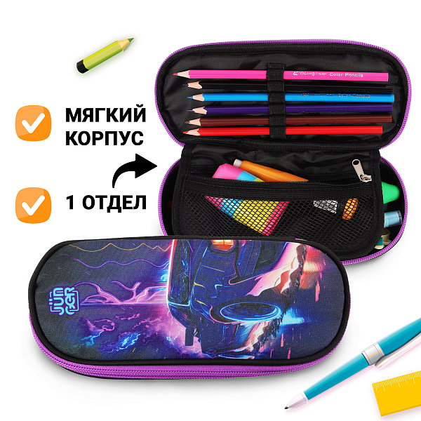 Внутри пенала — один большой отдел. Чтобы ребенку было проще сохранять порядок и находить нужный предмет, внутри пенала предусмотрены эластичные петельки для карандашей и ручек, а также сетчатый карман для ластиков, точилок и стикеров.