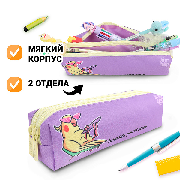 Пенал светло-фиолетового цвета украшен изображением забавного попугая и надписью. Пенал разделен на 2 отделения, которые закрываются на молнию. Размер аксессуара – 5х21х6 см, он компактный и не занимает много места в школьной сумке, при этом в него поместятся все необходимые ребенку письменные принадлежности.