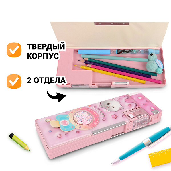 Пенал имеет два отделения, что позволяет организовать пространство и упорядочить предметы. Встроенная точилка с контейнером добавляет практичности, исключая необходимость носить отдельное приспособление. Внутри предусмотрено место для расписания занятий, что помогает школьнику быстрее ориентироваться в своем графике. Особенностью пенала является стойка для карандашей, которая позволяет держать основные письменные принадлежности под рукой во время творческого процесса.