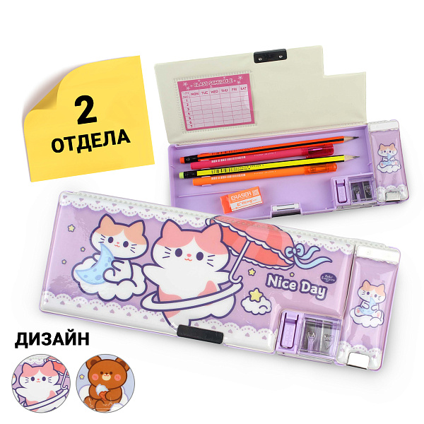 Сделан из прочных материалов, пенал гарантирует долговечность и устойчивость к ежедневному использованию. Очаровательные рисунки котиков и мишек на корпусе придают изделию яркий и позитивный вид.