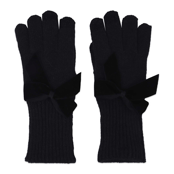 Перчатки выполнены в классическом черном цвете, что делает их универсальными и подходящими к любому наряду. Нежные бантики из бархата, украшающие каждую перчатку, придают образу нотку изящества и утонченности.