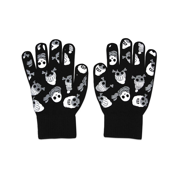 Практичные трикотажные перчатки в оригинальном оформлении привлекут внимание ребенка младшего возраста. Мальчик с удовольствием их наденет благодаря принту из скелетов и черепков. Изделия выполнены из плотного материала на основе ПАН и спандекса, они теплые и удобные. Широкая резинка надежно фиксирует аксессуар на руках, не пропускает холод и снег внутрь. Благодаря сочетанию черного и белого трикотажные перчатки будут чудесно сочетаться с любыми вещами. Долгое время сохраняют форму и эстетичный внешний вид. Рекомендовано для детей младшего возраста.