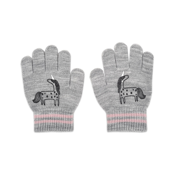 Трикотажные перчатки для девочек в спокойном сером цвете. Лицевую сторону модели украшает граничное изображение единорога. У модели широкая мягкая резинка. Она не дает перчатками сползать при носке, при этом удобно сидит, не сдавливает запястье. Будут незаменимы при играх и прогулках в прохладную погоду, не дадут детским рукам замерзнуть.