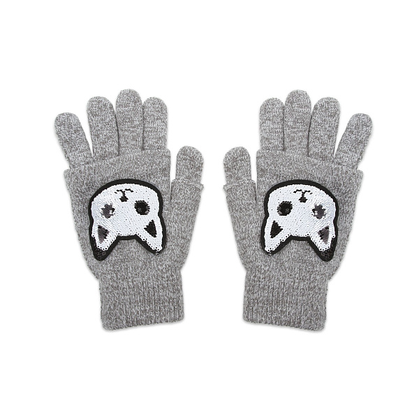 Если ребенок без ума от кошек, то эти перчатки точно станут любимой вещью в утепленном гардеробе. Трикотажные серые перчатки пошиты из искусственной шерсти (ПАН) и эластана – сочетание материалов обеспечивает упругость ткани, приятное прилегание к коже, а также бережное сохранение тепла и защиту от холода. Эластичные манжеты плотно прилегают к запястьям и препятствуют проникновению холодного воздуха. Дополнительно юную модницу порадует кошачья мордочка из пайеток – если перевернуть ее, то кошечка сменит цвет с белого на черный.