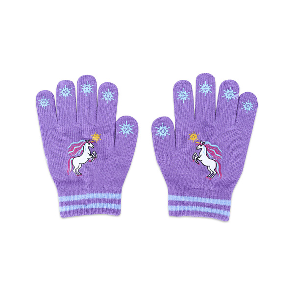 Трикотажные перчатки пригодятся в прохладную ветреную погоду. Они сохранят руки в тепле, не сковывают движений, поэтому в них удобнее играть на улице. Материал перчаток мягкий, на ощупь приятный трикотаж на основе ПАН и эластана. В них тепло при низкой температуре воздуха. Фиксируются перчатки на руке вязаной резинкой. Расцветка изделия фиолетовая, манжет украшен двумя голубыми полосками. На пальцах вышиты голубые звездочки, а тыльная сторона ладони декорирована аппликацией с изображением скачущего белого единорога.