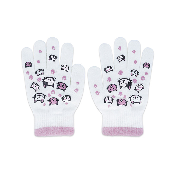 Белоснежные перчатки с принтами в виде разноцветных (розовых и черных) котят и розовых отпечатков кошачьих лап привлечет внимание каждой юной модницы. Рисунки котят и лап находятся как на тыльной стороне перчаток, так и на пальцах. Мягкая, но плотная резинка двухцветная: нижняя часть белая, а верхняя – розовая. Перчатки отлично согревают руки и впитывают влагу, благодаря чему ребенок сможет спокойно играть в снежки или строить фигуры из снега без вреда для кожи рук. Нейтральные цвета позволят комбинировать перчатки с верхней одеждой любого стиля и расцветки. В основе ткани использован ПАН и спандекс.