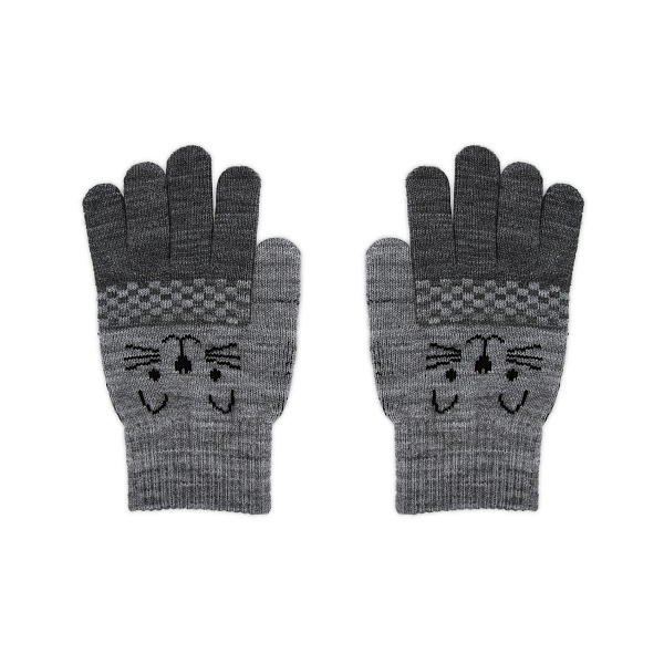 Трикотажные перчатки в сочетании светлого и темно-серого цветов понравятся ребенку своей лаконичностью. На каждой перчатке черной пряжей вышита мордочка котенка, а также есть вставки с квадратами темно-серых и светло-серых цветов. Плотная резинка будет удерживать перчатку на руке ребенка и не позволит ей слететь даже во время активных игр. Такие теплые и симпатичные перчатки не только согреют руки ребенка, но и подойдут под любую верхнюю одежду из-за нейтрального цвета. В основе ткани использован спандекс и ПАН, который схож с пряжей.