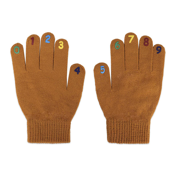 Детские перчатки горчичного цвета с разноцветными цифрами на пальцах – отличный выбор для межсезонья. Выполнены из мягкого и эластичного материала из 95% акрила и 5% эластана. Яркие цифры на каждом пальце не только украшают изделие, но и служат отличным инструментом для обучения ребенка счету в игровой форме. Манжеты на резинке плотно облегают запястья, не позволяя холодному воздуху попасть внутрь.